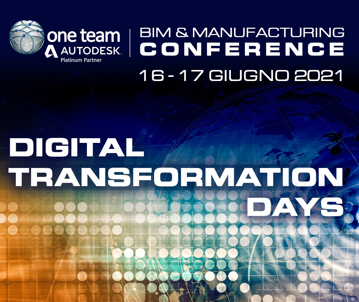 Dopo otto anni di BIM Conference, One Team decide di dare una veste diversa all’appuntamento annuale, facendolo diventare due giornate dedicate alla trasformazione digitale: i Digital Transformation Days. Il 16 e il 17 giugno saranno dedicati allo storytelling di quanto sta avvenendo ad oggi all’interno di due settori chiave della nostra economia: le costruzioni e la manifattura. Le due mattinate saranno l’occasione per raccontare le principali case history del settore manufacturing e i due pomeriggi si concentreranno invece sulle esperienze del settore construction.