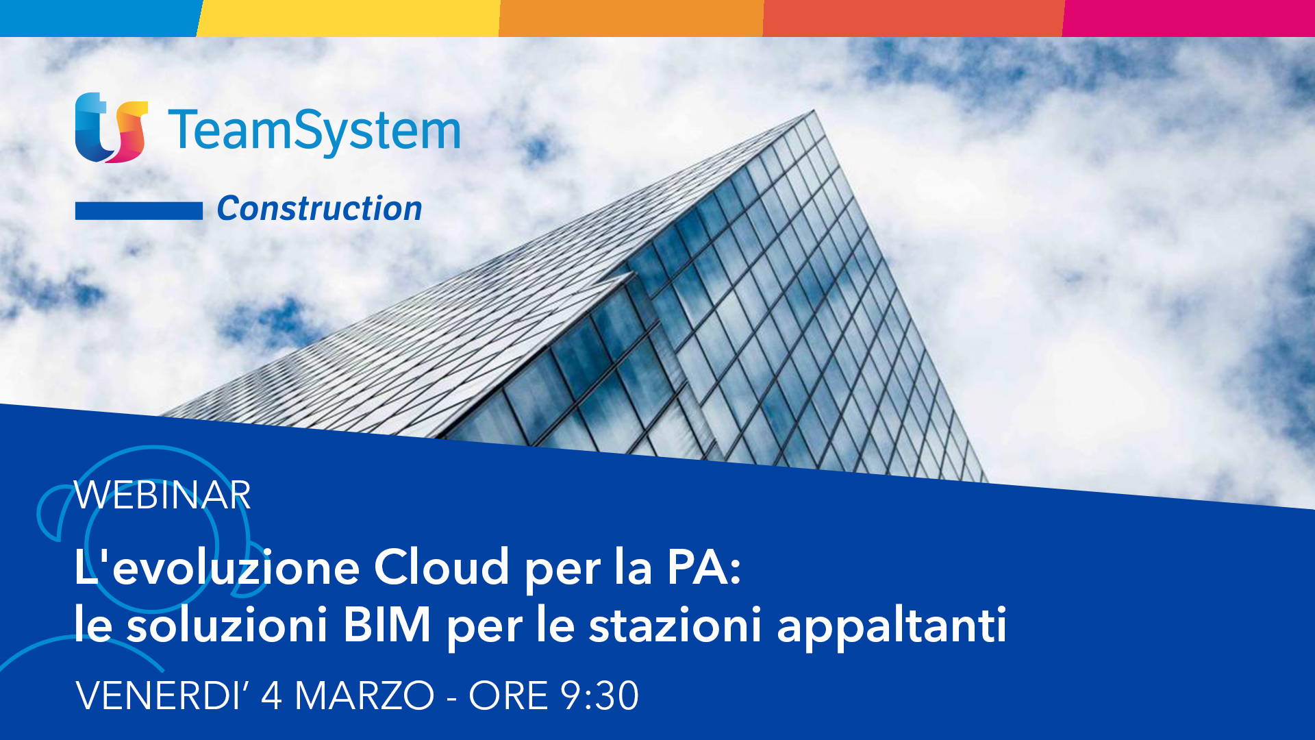 TeamSystem Construction organizza il webinar “L’evoluzione Cloud per la PA: le soluzioni BIM per le stazioni appaltanti” per venerdì 4 marzo 2022 dalle 9.30 alle 10.30.
