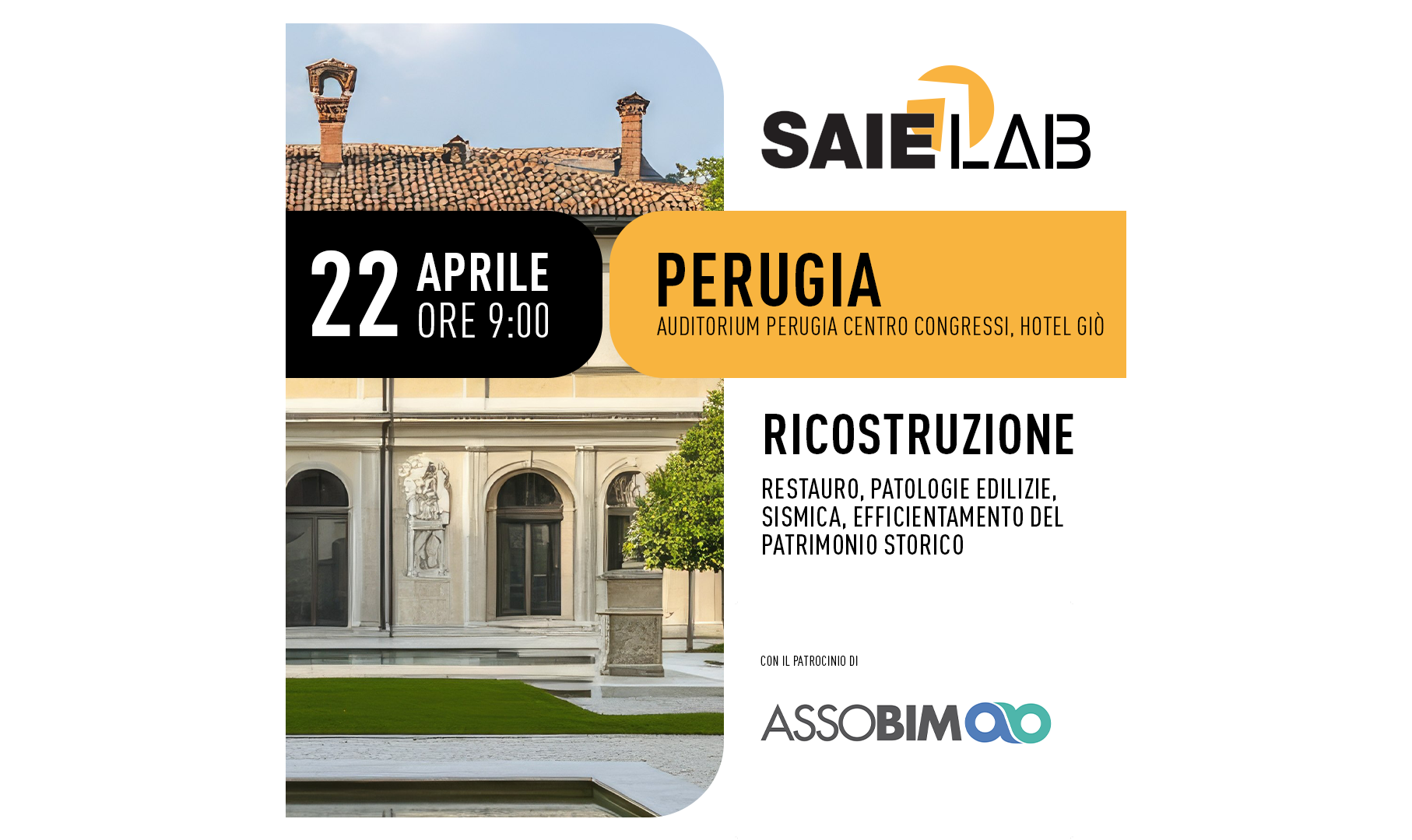 Si terrà il 22 aprile 2026, dalle ore 9 alle 17, a Perugia presso l’Auditorium Perugia Centro Congressi – Hotel Giò, Via Ruggero D’Andreotto 19, la seconda tappa di SAIE Lab, dal titolo “Ricostruzione: restauro, patologie edilizie, sismica, efficientamento del patrimonio storico”.L’incontroèpatrocinato da ASSOBIM,