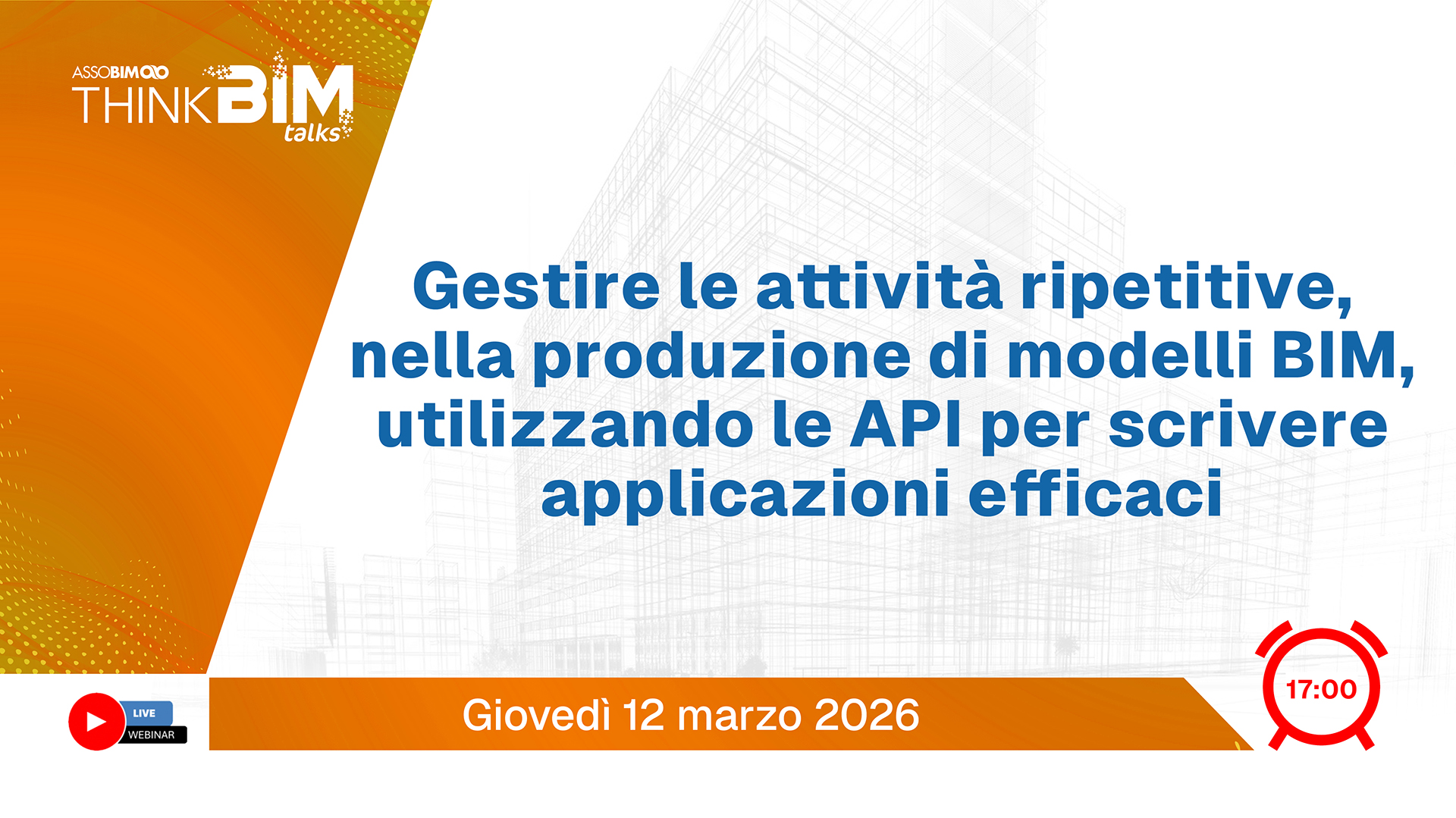 ASSOBIM organizza il Talks “Gestire le attività ripetitive, nella produzione di modelli BIM, utilizzando le API per scrivere applicazioni efficaci” per il giorno 12 marzo 2026 dalle ore 17.