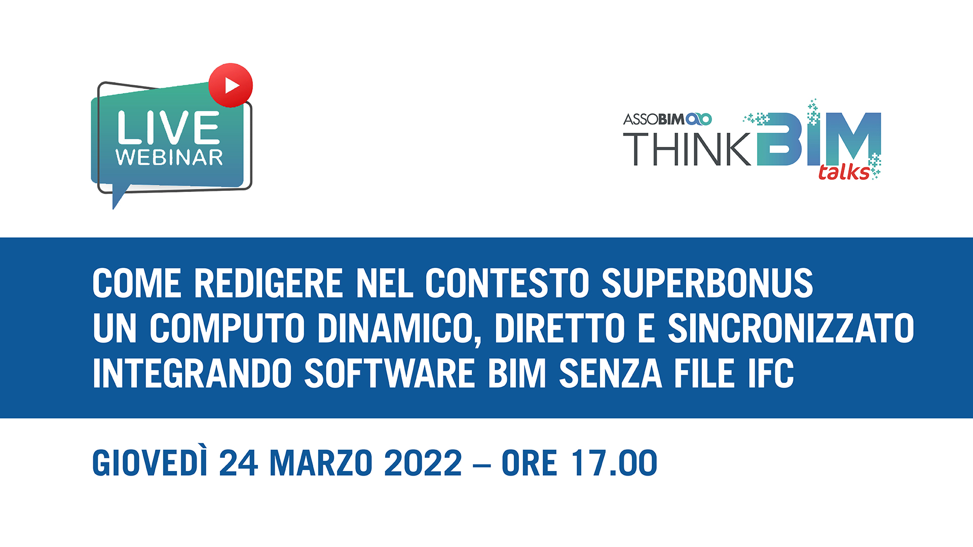 ASSOBIM organizza il Talks “Come redigere nel contesto Superbonus un computo dinamico, diretto e sincronizzato integrando software BIM senza file IFC” per il giorno 24 marzo 2022 dalle ore 17.