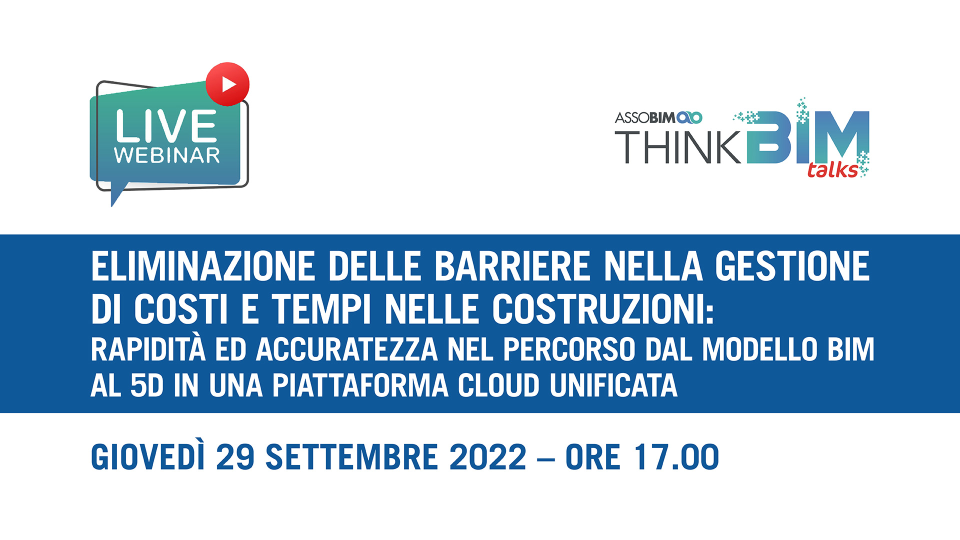 ASSOBIM organizza il Talks “Eliminazione delle barriere nella gestione di costi e tempi nelle costruzioni: rapidità ed accuratezza nel percorso dal modello BIM al 5D in una piattaforma cloud unificata” per il giorno 29 settembre 2022 dalle ore 17.