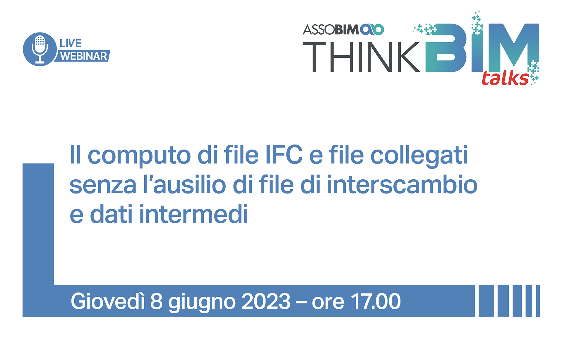 ASSOBIM organizza il Talks “Il computo di file IFC e file collegati senza l’ausilio di file di interscambio e dati intermedi” per il giorno 8 giugno 2023 dalle ore 17.